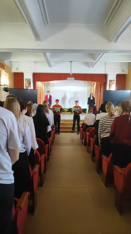 Минутой молчания участники почтили память бывших студентов, погибших в военных конфликтах. Юнармейцы Егор Юдин и Артем Морин возложили гирлянду к мемориальной доске.